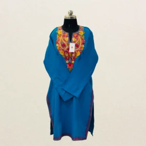 The Cashmilon Aari Embroidery Green Kurti is a beautiful blend of style and comfort, crafted from a premium 55% wool and 45% polyester mix for warmth and a smooth texture. The kurti features delicate Kashmiri Aari embroidery, adding a unique touch to the sky blue color. Designed with a knee-length fit and full sleeves, it offers both elegance and ease. Ideal for various occasions, it comes with perfect stitching for a flattering, comfortable fit. For maintenance, dry clean only, and avoid bleach. Enjoy the convenience of cash on delivery within India, with slight color variations possible due to screen settings.
